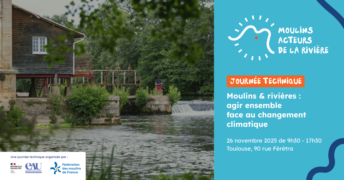 Dans le cadre du projet « Moulins, acteurs de la rivière », la Fédération des Moulins de France (FDMF) et l’Agence de l’eau Adour-Garonne coorganisent une journée technique inédite sur le thème : « Moulins & rivières : agir ensemble face au changement climatique » le 26 novembre prochain.